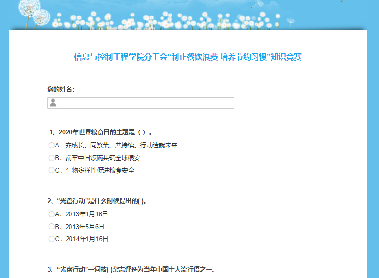 为深入贯彻落实习近平总书记关于制止餐饮浪费的重要指示精神,积极倡导广大师生养成良好节约习惯,形成“厉行节约、反对浪费”的校园文明新风。根据《青岛理工大学“制止餐饮浪费 培养节约习惯”行动方案》的通知要求,12月14日至16日,信息与控制工程学院分工会开展“制止餐饮浪费 培养节约习惯”线上知识竞赛活动。近120名教职工参加了此次活动,该活动得到了校工会的大力支持。