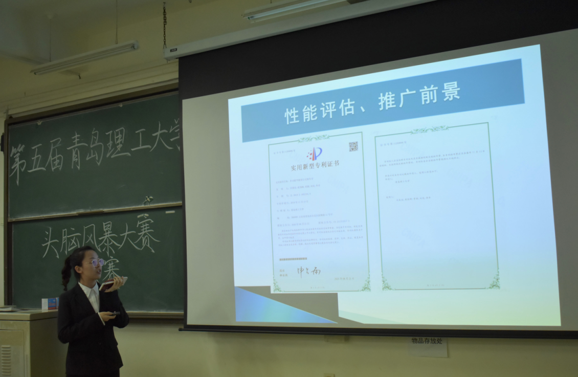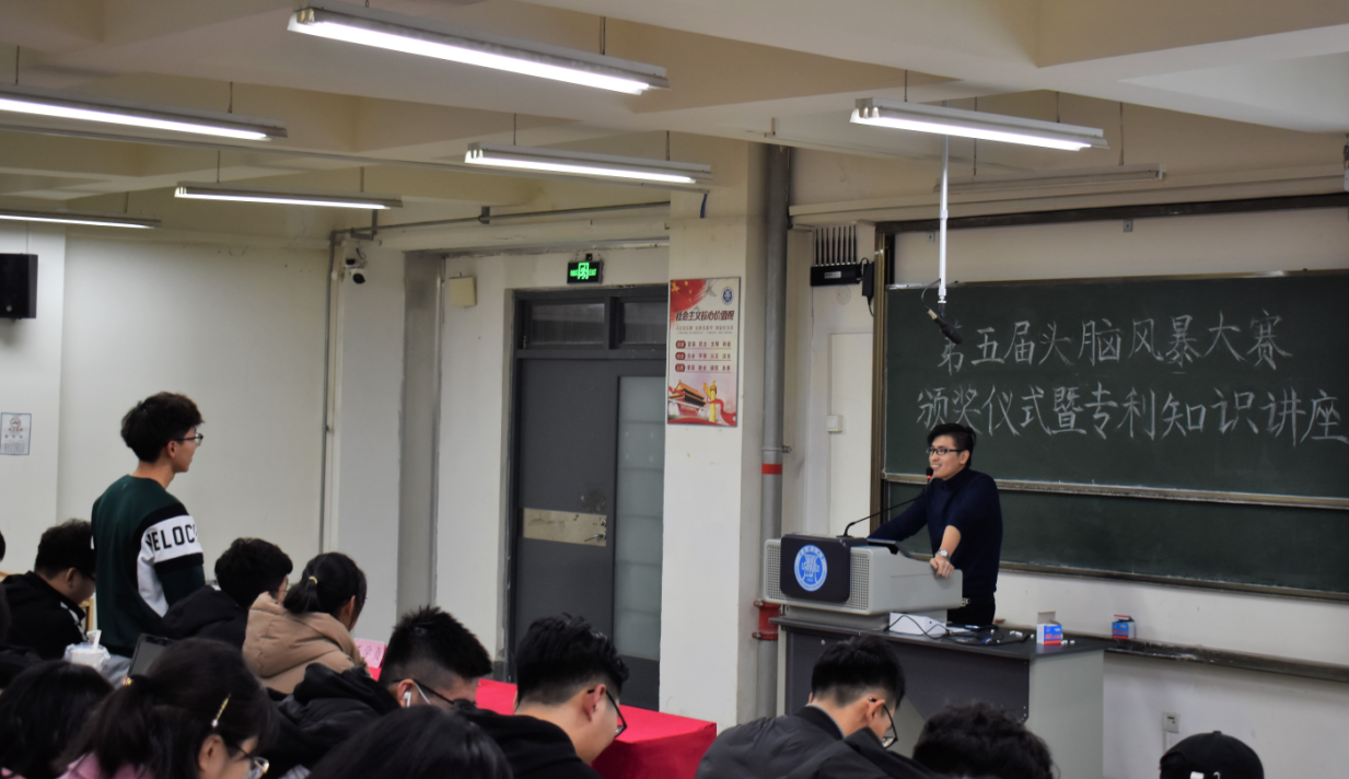 参加答辩的选手们以自己制作的PPT或视频对作品进行了详细的介绍。有的选手以当今中国最大的热点——垃圾分类为背景,设计了新型的垃圾分类装置,并从多个方面说明了装置的可行性;有的选手则以新能源为背景设计了海浪发电装置,利用海浪上下起伏的势能,最终转换为电能。选手们从科学性、创新性、实用性等不同角度说明作品的优势的同时也从可行性,造价等方面客观说明作品的不足。经过决赛激烈的比拼,评审对参赛选手的作品进行了评分,最终五项作品获得了优秀奖、一项作品获得了最佳人气奖、四项作品获得三等奖、四项作品获得了二等奖,而作品“一种新型双扇防火门”凭借其设计的创新性和科学性获得了本次大赛的一等奖。在颁奖仪式暨专利知识讲座环节,中政科联专利所的王学贞先生通过幽默简单的语言就专利申请的渠道流程等进行了详细专业的讲解。问答环节同学们就专利申请方面存在的疑问向王学贞进行了提问,王学贞也对同学们提出的问题进行了详细的解答。讲座在同学们热烈的掌声中结束。持续了三周的“头脑风暴”创意征集大赛终于落下帷幕。