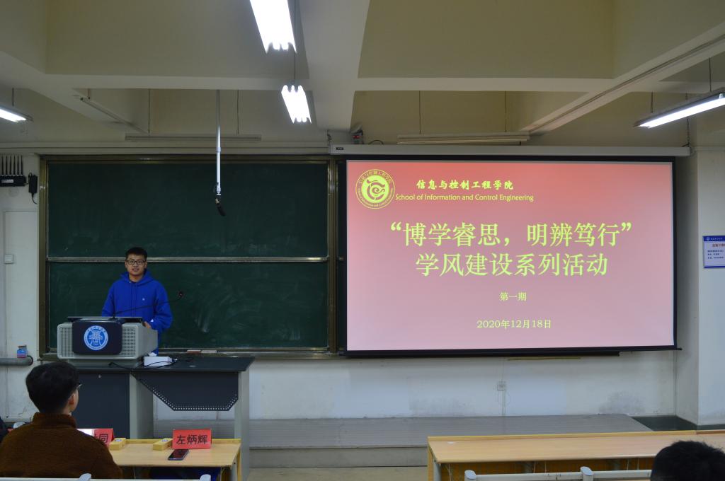 为了全面贯彻党的教育方针,落实“立德树人”根本任务,加强学院学风建设,营造良好的学习氛围,帮助2019级同学掌握良好的学习方法,提升自身科技创新能力,做好自身的职业生涯规划。信息与控制工程学院本科学生四支部精心策划了“博学睿思,明辨笃行”学风建设月活动。第一期学风建设月活动于12月18日晚在主教楼B235举行,由组织委员季献涛主持,19级计算机、自动化专业全体同学参加。