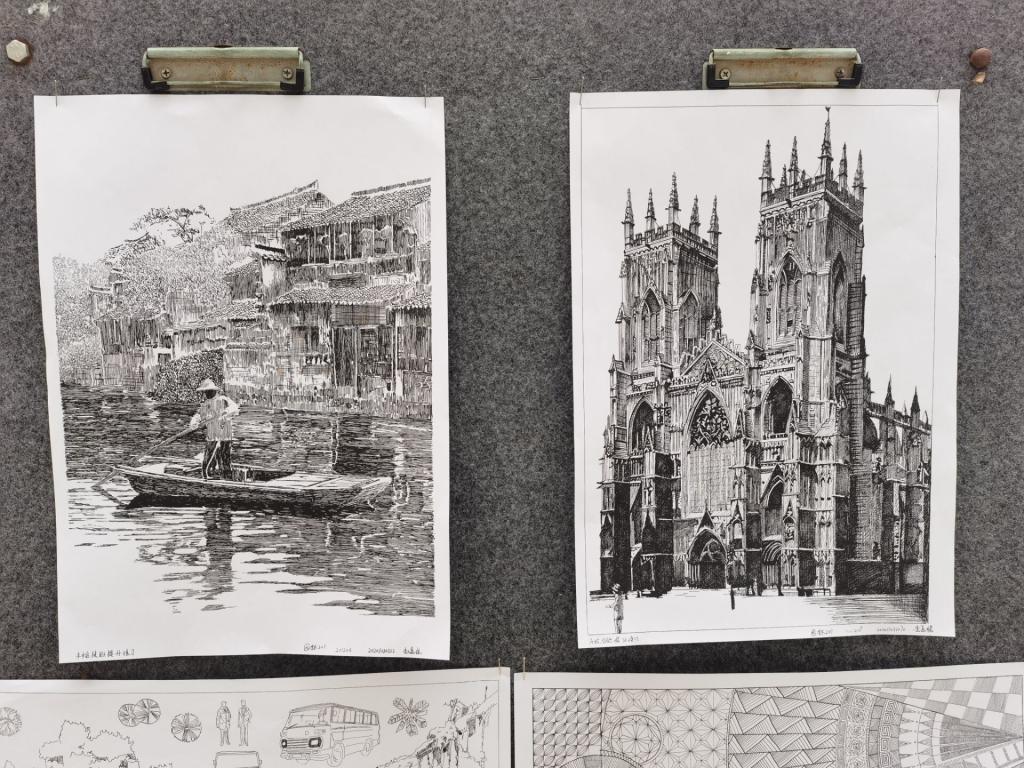 本次活动面向2020级建筑、建本、城规、园林系大一新生,由王少飞、毕胜、解旭东等老师统一评选出100余幅构思新颖、细腻勾勒的徒手线与钢笔画作业。展出的徒手线作业设计新颖、构图精美,通过线条的疏密、粗细编制成一幅幅变化丰富、张弛有度的图案,充分展现了建筑与城乡规划学院学生出色的创作能力及较强的基础技能。钢笔画作业中涉及山峦连绵的漓江风光、高大壮美的基督喋血大教堂、笔触细腻的塔式建筑等,同学们通过轻快流畅、纵横交错的线条构成一幅幅笔墨横姿的钢笔画,吸引了许多师生驻足欣赏,近距离感受线条、笔墨的独特魅力。