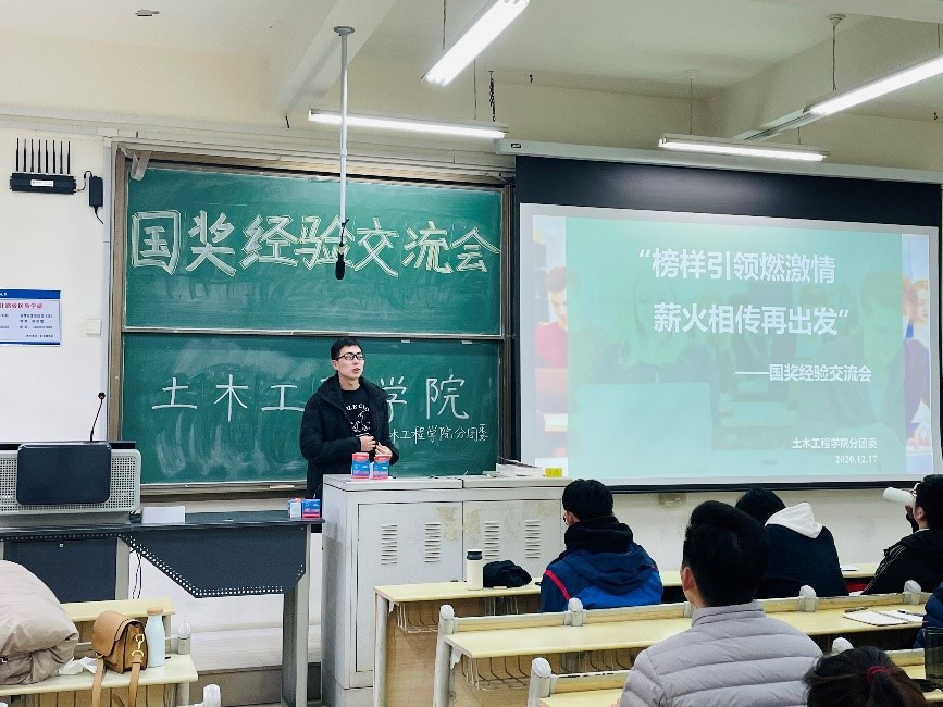 为了提高同学们科研学术能力,促进班级优良学风建设,12月17日,土木工程学院分团委于嘉陵江路校区主教学楼B207召开“榜样引领燃激情,薪火相传再出发”国奖经验交流会,会议邀请2020年研究生国家奖学金获得者分享各自的科研经历、学习心得以及就业方向,传递榜样力量。