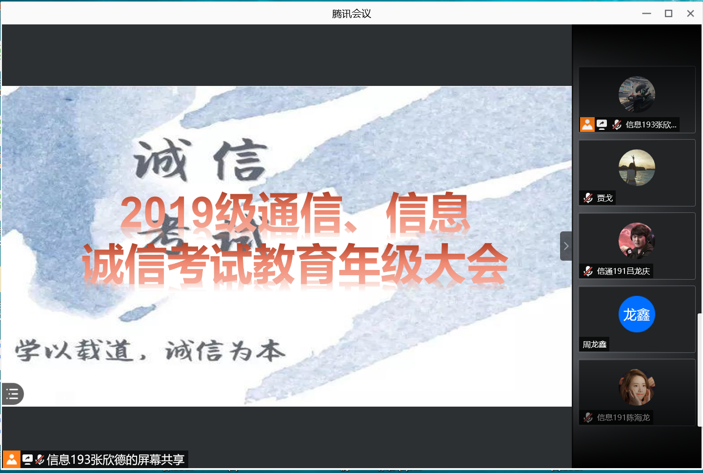 为严肃考风考纪,营造良好考试氛围,引导学生做诚信之人,12月29日上午,信息与控制工程学院举办了2019级通信、信息诚信考试教育年级大会线上会议。活动由辅导员贾戈老师主持,19级通信、信息专业全体学生参加此次大会。