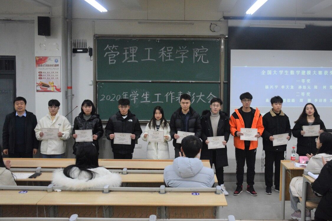 会议通过PPT展示的方式,带大家一起回顾了一年来开展的工作,全面总结了一年来取得的成绩和存在的不足,指明了下一步努力的方向;会议还对2020年推免研究生、全国大学生数学建模竞赛、美国大学生数学建模竞赛、全国大学生数学竞赛、全国大学生房地产策划大赛、全国大学生智慧供应链创新创业挑战赛、全国大学生物流仿真设计大赛、企业竞争模拟大赛、全国高校BIM毕业设计创新大赛、国创省创立项、优秀运动员、活力团支部等13个奖项进行表彰。
