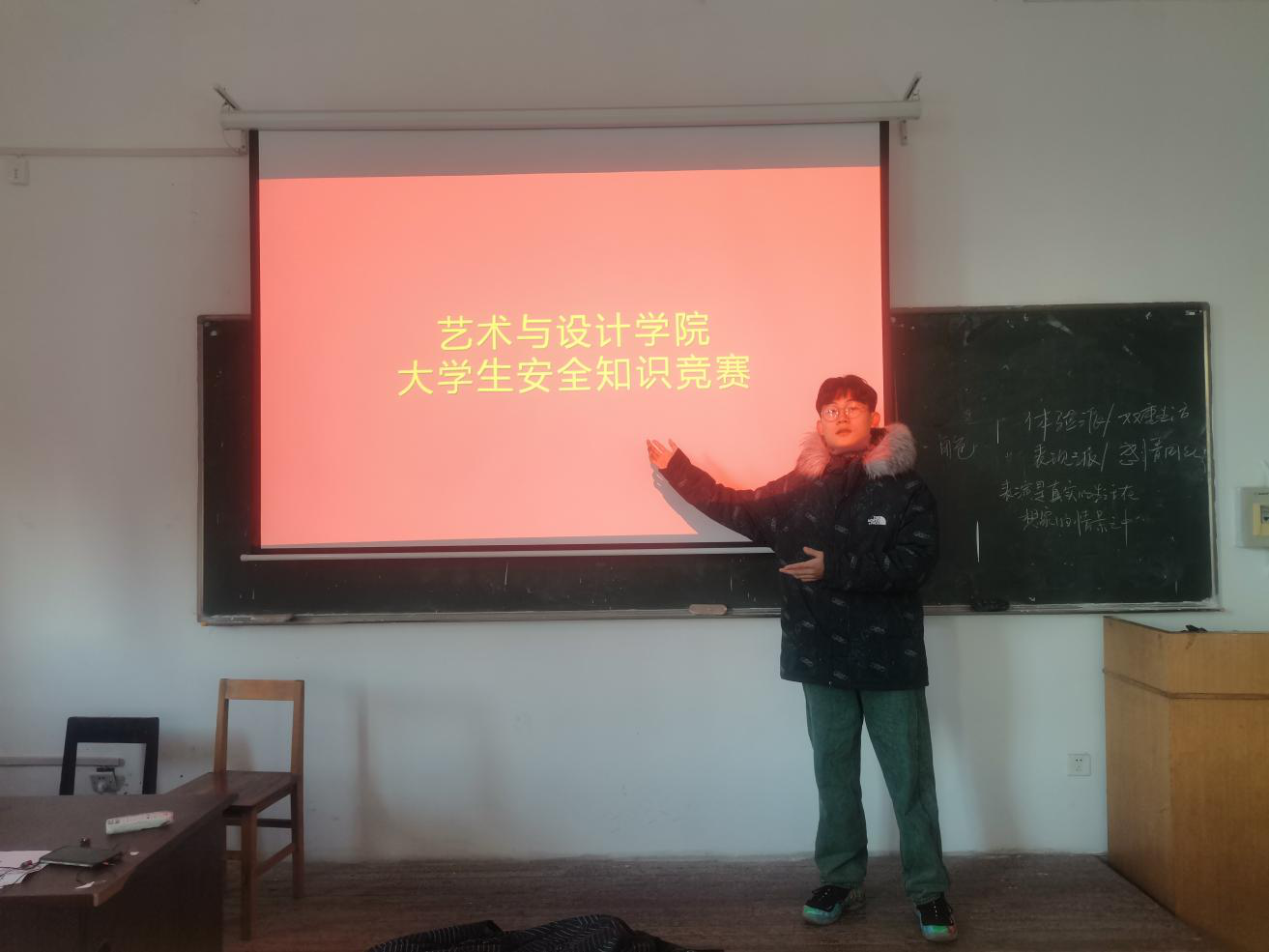 为提高学生安全意识,加强其安全知识的培养与积累,提高全体大学生的安全意识,普及校园安全知识,艺术与设计学院于1月5日下午在二号教学楼308教室,开展了大学生安全知识竞赛活动,活动由艺设201董如泽主持。
