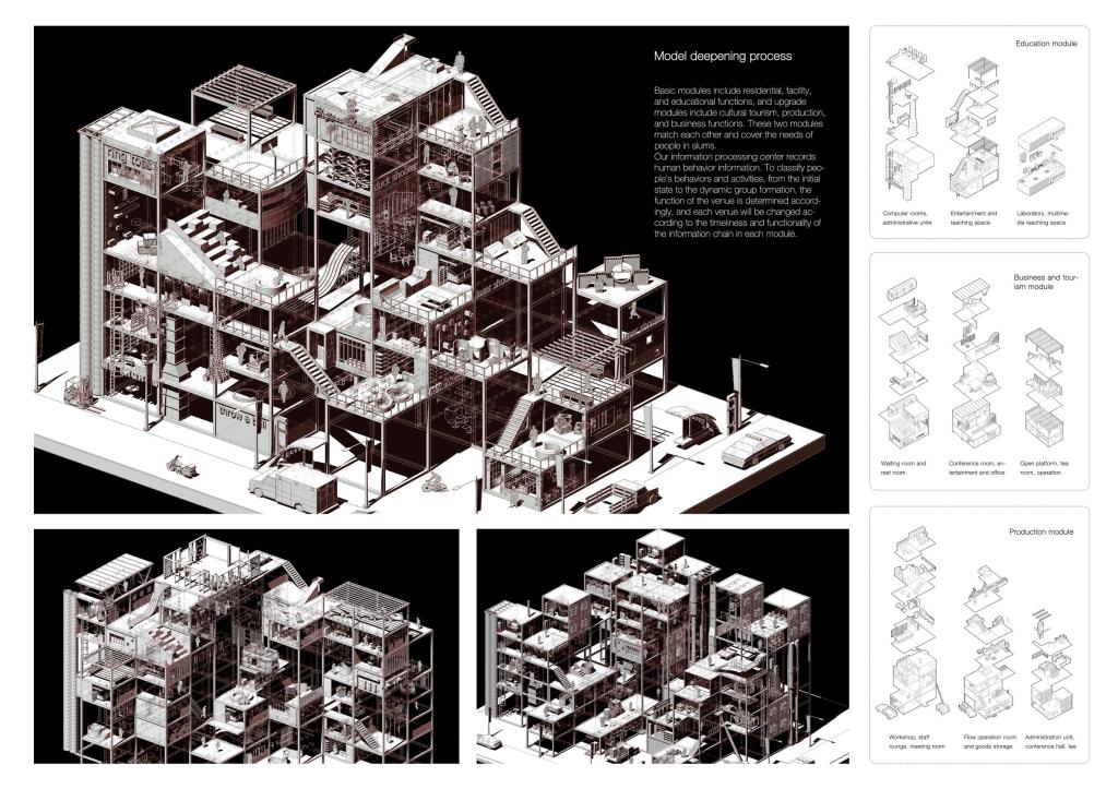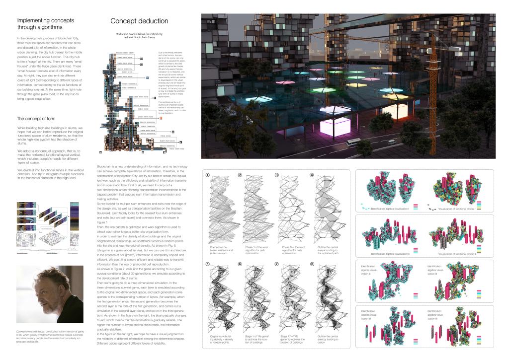获奖作品《Block Favela》对巴西贫民窟——Favela进行重新设计,取其“充满生命力的野花村”之意。野花常有顽强的生命力,自由地开放成长,作品以此为出发点,通过规划去帮助重建贫困社区,发挥贫民窟自己的力量去克服疫情带来的挑战。作品试图去创造一种新型的模式,保留贫民窟的原型,在改善硬件基础设施的同时让居民仍有归属感。此外,设计推翻了以往平民窟平面化扩建的模式,意识到应该去做一些垂直方向上的延申以获得更多的公共空间并降低人群活动交叉可能性,因此在保留贫民窟规划本身充满随机性特色的基础上,结合区块链的机制相做出了一个垂直社区。整个作品从特殊的视角抓取设计的精髓,用大胆的创意最终获得了评委团的青睐,展现了建筑与城乡规划学院学子优秀的设计能力和专业素养。