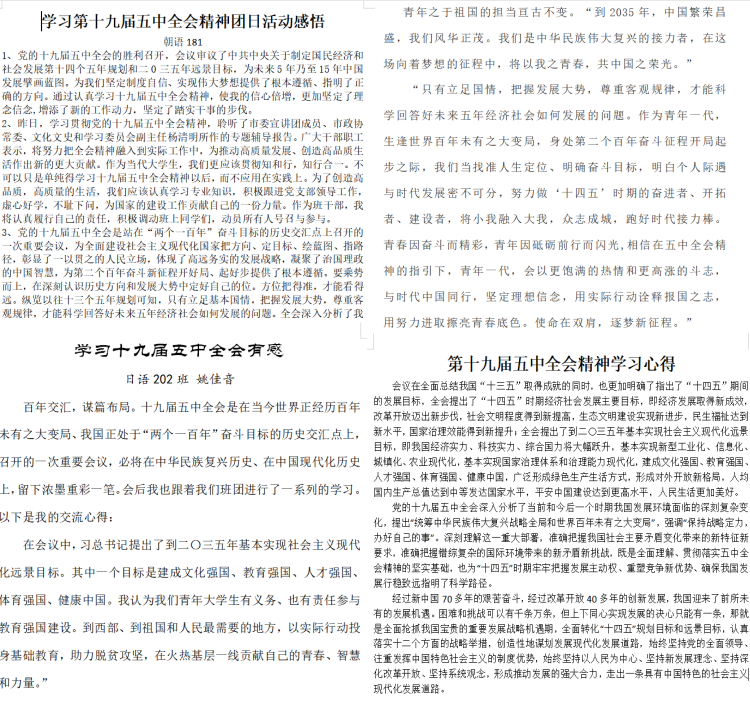 新时代中国青年的使命,就是坚持中国共产党的领导,同人民一道,为实现“两个一百年”奋斗目标、实现中华民族伟大复兴的中国梦而奋斗。我院各班团支部紧随时代步伐,以“学习党的十九届五中全会精神”为主题开展“学习沙龙”,团支部书记领着学,团员跟着学,贯彻落实十九届五中全会精神,把学习贯彻五中全会精神作为当前和今后一个时期的主题团课学习任务。朝语181班在活动感悟中写道:“作为当代大学生,我们更应该贯彻知行合一,为实现中国梦不懈奋斗,同时认真学习专业知识,笃行不怠。”