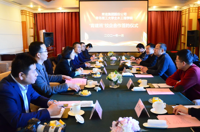 曲成平介绍了学校、学院的历史沿革和概况、学院的师资队伍、学科建设、人才培养等情况。重点介绍了学院土木工程学科获批山东省“高峰学科”,土木工程专业顺利通过工程教育专业评估(认证)相关事宜。他指出,学院与青建集团已有多年的合作,双方在科研平台建设、产教融合、学生实习就业等方面的合作成效良好,希望通过此次“青建班”设立,加深校企合作,实现双方共赢。