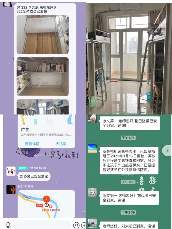 学工干部首先各自召开年级学生大会,强调好假期离校要求,落实好请假登记、公寓卫生、台账轨迹报送以及出行安全教育,全体学生表明会遵守校规校纪,按照要求离校返乡,注意自身安全。而后,辅导员利用微信家校群向家长确认学生离校信息,根据家长提供的信息进行学生寒假离校信息进行批复。与此同时,积极组织完成期末考试的学生进行宿舍卫生大扫除,将个人床铺、桌面收拾整齐、安全断电的宿舍照片提交至学生大群内,确保宿舍安全整洁。离校前学生需进行轨迹报送、台账报送清晰,更需要提交保证书,保证打扫好公寓卫生,保证离校安全出行,保证两点一线回家不在外逗留。